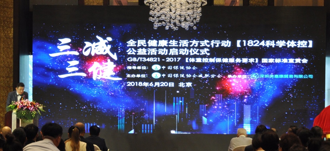 為積極響應(yīng)國(guó)家衛(wèi)計(jì)委、體育總局、全國(guó)總工會(huì)、共青團(tuán)中央和全國(guó)婦聯(lián)共同制定的《全民健康生活方式行動(dòng)總方案(2017-2025)》精神的總目標(biāo),宣傳“減鹽、減油、減糖”的健康理念,提高全民 “健康的口腔、健康的體重、健康的骨骼”的保健知識(shí),以達(dá)到提高人民群眾健康生活水平的目的,同時(shí)為配合《體重控制保健服務(wù)要求》國(guó)家標(biāo)準(zhǔn)正式實(shí)施。中國(guó)保健協(xié)會(huì)減肥分會(huì)與深圳美嘉康貿(mào)易有限公司于2018年6月20日成功舉行了“‘三減三建’全民健康生活方式行動(dòng)1824科學(xué)體控公益活動(dòng)啟動(dòng)暨GB/T 34821-2017 《體重控制保健服務(wù)要求》國(guó)家標(biāo)準(zhǔn)宣貫會(huì)”。